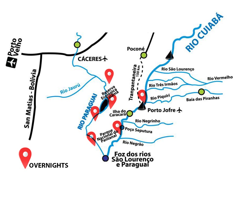 I Porto Jofre ligger vår motoryacht MS Akaia som skall härbärgera oss under de nästkommande fem nätterna i norra Pantanals vattenvärld. Vi installerar oss ombord i våra hytter och äter en god middag. Under natten stävar vi uppströms längs Paraguayfloden. Under dagarna ombord kommer vi att njuta av Pantanals berömda solnedgångar som närmast verkar målade på himlen för hand samt det stjärnfyllda himlavalvet. Kanske fiskar vi piraya till kvällens soppa? Vi äter både kött men framförallt fisk och frukt från regionen under våra dagar ombord.