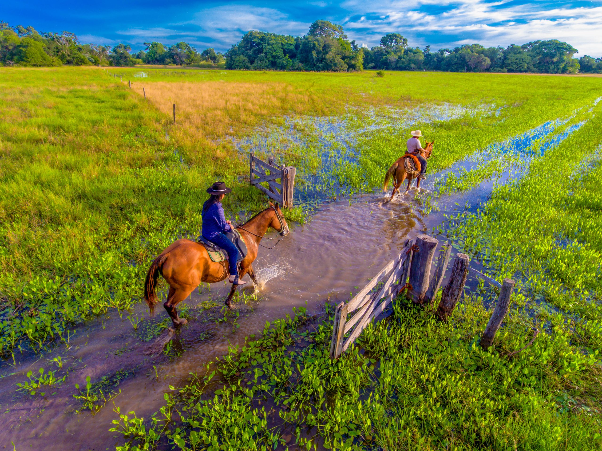 Tidig morgon avnjuter vi en quebra torto pantaneiro, en gedigen pantanalcowboyfrukost, med stekt ris med grönsaker och kött eller bacon samt stekt ägg. Fågellivet i regnskogen upplevs alltid bäst i gryningen och när dimmorna lättar går vi upp för att se fåglarna vakna till liv. Under dagen utforskar vi stigarna kring lodgen från hästryggen där vi tyst tar oss fram för att på bästa sätt närma oss djurlivet runtomkring oss. Luften är mättad av dofter och vår guide lyssnar uppmärksamt efter fåglars läten och prasslande löv. Har vi tid ger vi oss ut och utforska livet på vattnet för att fiska piraya och fågelskådning.