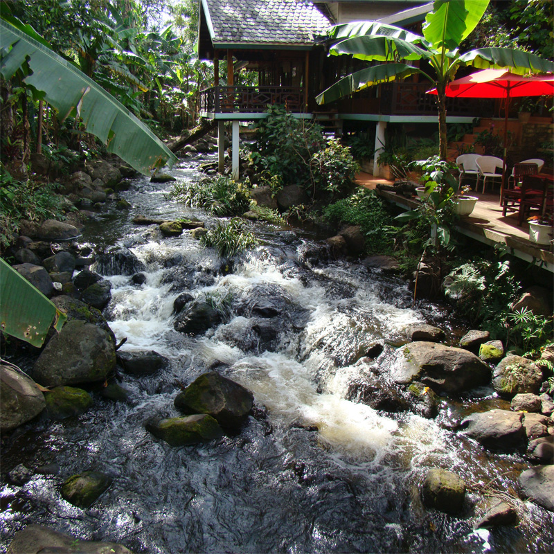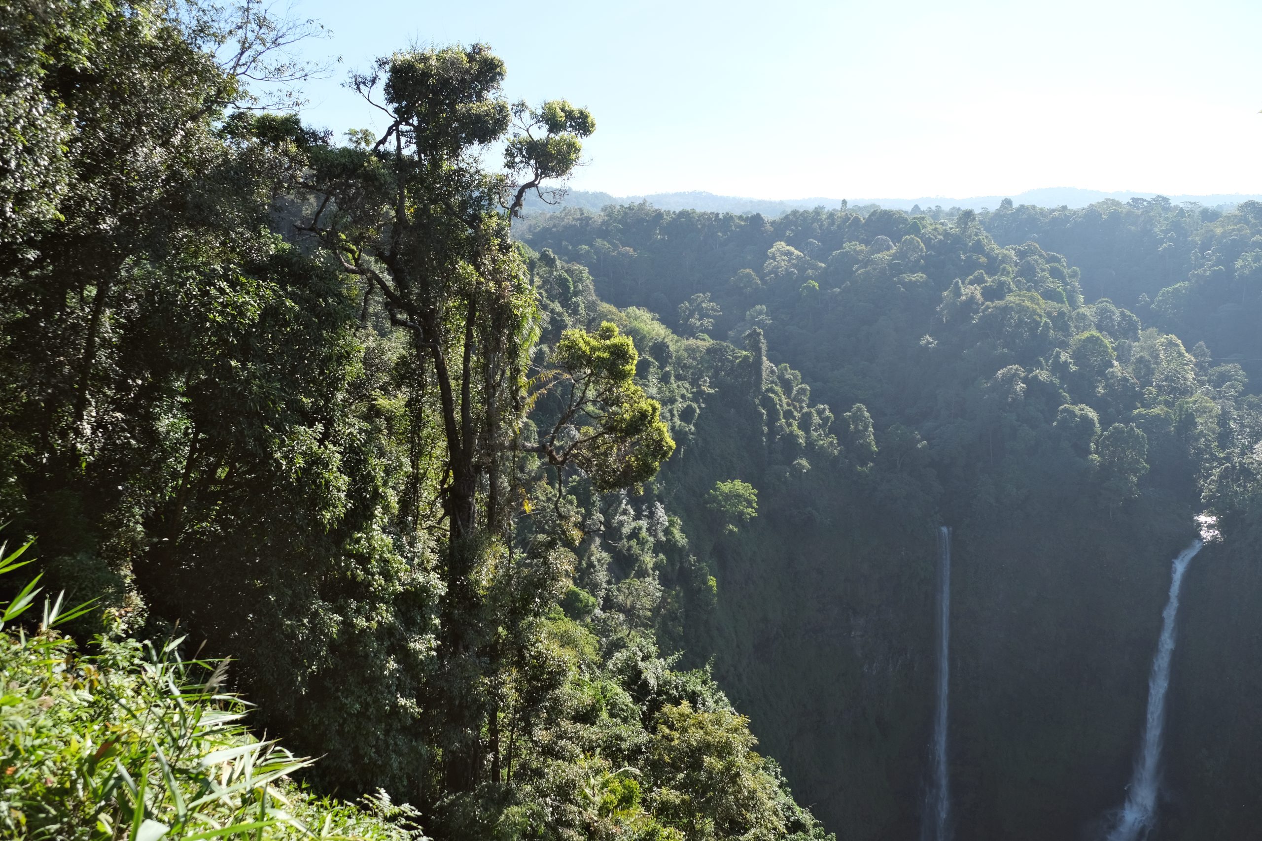 Här finns möjlighet att göra en adrenalinstinn zipline färd ca 300 meter över de berömda tvillingvattenfallen, den högst belägna i landet på ca 470 meters höjd. Vi checkar sedan in på vår enkla mellanklassresort Sabaidee Village för en natt.