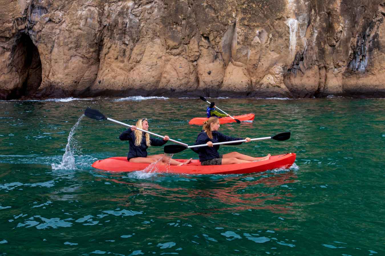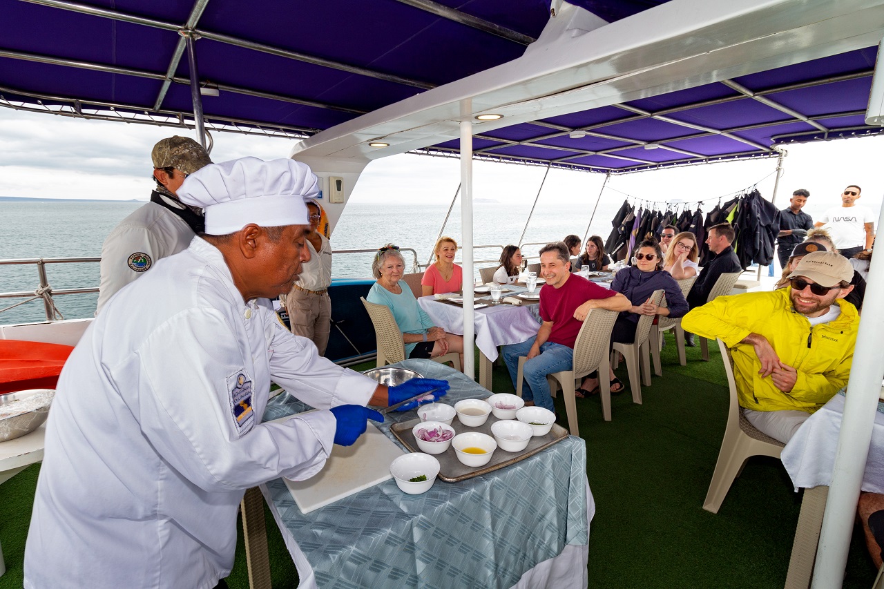 Åter ombord efter morgonens aktivitet väntar uppfriska juice och snacka och kort därefter intar vi en trerätters lunch. Efter lunch finns tid för avkoppling ombord innan det är dags att ge sig av på dagens andra utflykt som oftast består av en snorkling tur. Våtdräkt och cyklop finns att låna ombord och när väl utrustningen är på tar vi våra gummibåtar ut för att kliva ifrån båtarna. Vi snorklar tillsammans längs klippväggar och vid vackra sandstränder och upptäcker det fantastiska marina djurlivet under ytan. Nyfikna sjölejon gör oss oftast sällskap och även havskölpaddor, pingviner och rockor kan simma förbi till vår stora förtjusning. När vi kommer tillbaka väntar en uppfriskande dryck och därefter känns det skön att sjunka ned med en bok eller bara sitta och blicka ut över havet har vi tur kan vi se både hoppande rockor och delfiner från däck.