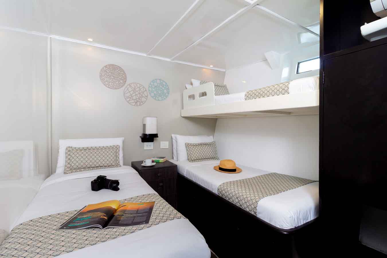 De tio hytterna har luftconditionering och är utrustande antingen med dubbelsängar, separata sängar eller som trippelhytt med våningssängar. Samtliga har privat toalett och dusch. Hytterna är fördelade på övre och nedre däck med 6 hytter på övre däck (1 dubbel & 5 twin) och 4 hytter på nedre däck (2 dubbel & 2 twin/triple). Detta fartyg är byggt för kryssningar kring ekvatorn i Galapagos övärld. Det finns luftkonditionering i alla utrymmen på båten, stora gemensamma ytor i salongen och flera trevliga utomhusdäck. Därför är hon det perfekta valet för en behaglig kryssning i den vackra miljön runt Galapagos.